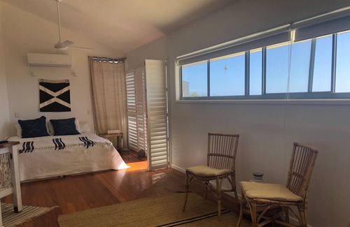 the upstairs has a king bed with an ensuite. a large open room with ocean views. there is also a balcony to enjoy -perfect for whale watching by day and a blanket of stars at night. also tv to watch from bed with local stations, and apple tv.