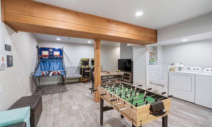 Full game room area with 2 arcades, mini hoops, multiple game table (foosball, ping pong, pool, etc.), additional pac-man arcade games on TV, and large size TV