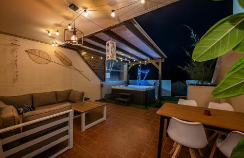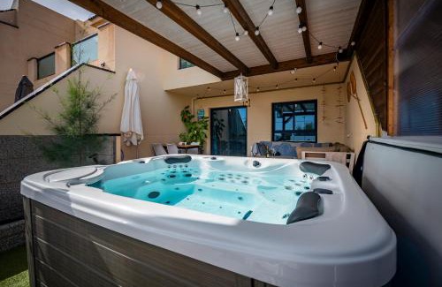 Food & DrinkTea/Coffee maker, Bottle of water, FruitBathroomBathtub or shower, Hairdryer, Toilet, Spa tub, Bathrobe, Private bathroom, Conditioner, Body soap, Free toiletries, Towels, Toilet paper, Shampoo, Guest bathroom, ShowerMedia & TechnologyFlat-screen TV, Cable channels, Streaming service (like Netflix), Pay-per-view channels, TVGeneralAir conditioning, Fire extinguisher, Private entrance, Heating, Tile/Marble floor, Fan, Smoke Alarm, Iron, Trash cansActivitiesHot tubKitchenWine glasses, Cleaning products, High chair, Stovetop, Dishwasher, Kitchenware, Electric kettle, Oven, Toaster, Coffee machine, Dining table, Microwave, Kitchen, Refrigerator, Kitchenette, Washing machineOutdoorsPrivate pool, Outdoor dining area, Outdoor furniture, Terrace, BalconyLiving AreaDining area, Sitting area, Sofa, DeskViewQuiet street view, View, Garden view, City view, Sea view, Lake viewBedroomLinens, Childrens' cribs, Wardrobe or closetBuilding CharacteristicsSemi-detached, Private apartment in buildingRoom AmenitiesSocket near the bed, Drying rack for clothing, Hypoallergenic pillow, Clothes rackEntertainment & Family ServicesBoard games/puzzlesPool and SpaHeated poolPhysical distancingSingle-room AC for guest accommodation |