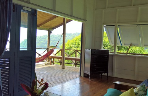 Bella Vista is a cozy one bedroom, one-bathroom wooden cottage perched on a steep hillside. The cottage sits on an acre of lush garden amidst tropical flowers, and fruit trees. The location is ideal for bird watching - motmot, bananaquits, parrots, tanagiers, corn birds, hummingbirds, cocricos (Tobago's national bird) and others. Place a banana on the feeder and hang out on the deck for the show!