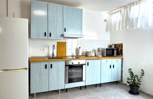 This cozy apartment, located on a semi-basement level, offers everything you need for a comfortable stay: a fully equipped kitchen, a living room, a separate bedroom, and a bathroom. The natural materials and soft, calming tones create the perfect atmosphere to relax and recharge.