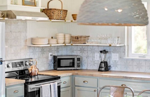 Belle Vue Cottage’s sleeping accommodations consist of a king bed in the master bedroom and a queen with a lofted twin bed in the guest bedroom that will perfectly fit your family! This light-filled, recently updated 1,100 square foot cottage features a real wood-burning fireplace, two brand new bathrooms, and a professionally designed interior. Prepare a picnic in the charming full kitchen or step outside onto the 900 square feet of outdoor living space for an afternoon cookout and to watch the wildlife scampering about. Additionally, the state-of-the-art kitchen is complemented with the newest appliances and amenities to fulfill your every need, as is sure to delight even the most discerning hobby chefs and foodies alike!