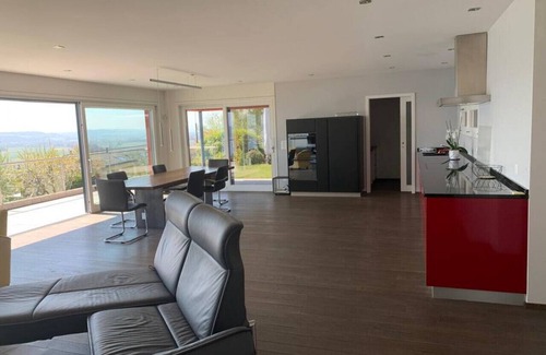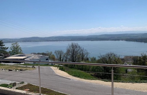 Beautiful villa with a breathtaking view of Lake Murten. The villa is located in a very quiet area and has two bedrooms. It is ideal for a relaxing stay or for holiday. The house is situated in a dead end street. This ensures that there is no traffic noise. On the other hand, this makes access by public transport very difficult. It is therefore recommended that guests have their own vehicle for the stay.