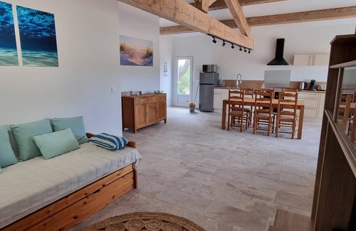 The large living room/kitchen overlooks the large bay window. This large space could potentially accommodate a large family who may have reserved several accommodations on the estate. As such, we are in partnership with a caterer from Lézignan Corbières who can, if necessary, offer you menus for your group meals.