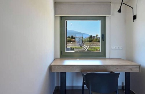 On the ground floor there is a bedroom with two single beds joined together and on the first floor there is a bedroom with a double bed and an armchair that can be converted into a single bed. The upstairs room has a space where a desk (with chair and desk lamp) can be developed with a view of Mount Olympus. This room also has a terrace with an outdoor living room (two armchairs and a coffee table) with a view of the sea.
