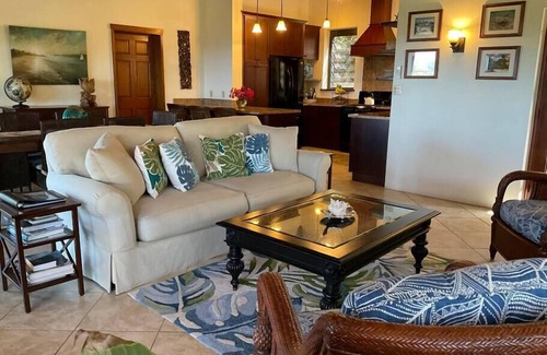 Beautiful mahogany French doors link the stunning veranda to the open-concept, fully air-conditioned great room, which features a well-appointed kitchen with counter seating, a charming dining area, and a comfortable living room for indoor entertaining.