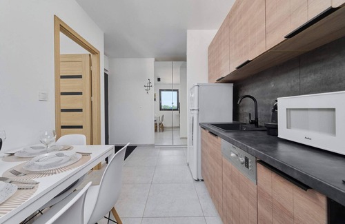 This comfortable and stylish apartment can accommodate 5 people. It is an ideal choice for a family or a group of friends. The interior offers a cosy, modern atmosphere thanks to its trendy colour scheme with interesting decorative elements. The functionally arranged 45 m² area consists of a living room, a bedroom, a separate kitchen and a bathroom with shower. The living room has a comfortable sofa bed and two single beds. The bedroom has a double bed and a desk for remote working or studying. The apartment also has a private balcony with garden furniture, ideal for enjoying your morning coffee. A definite plus is the high speed wifi internet throughout the property and a flat screen TV - perfect for watching films. The wide range of amenities and the fact that the apartment is fully equipped with the necessary accessories and equipment for the kitchen (coffee machine, microwave, dishwasher, oven) and bathroom (washing machine, hairdryer) guarantee a comfortable stay. The apartment is also equipped with a fan and humidifier to provide our guests with a comfortable temperature regardless of the weather. A complimentary set of toiletries (soap, shampoo and shower gel), towels and bed linen are provided to facilitate the start of each stay. Fully equipped and tastefully decorated, the apartment is distinguished by its attention to detail, aesthetic finish and functionality. The entire interior is harmonious, warm and modern. For guests arriving by car, there is a private parking space in the garage, which is particularly convenient in the city centre.