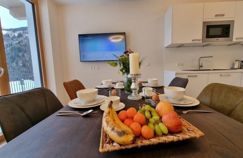 See: Very modern, beautiful apartment block "Bergschnucke Homes", 1'220 m a.s.l 4 storeys, built in 2022. Above See, in a quiet, sunny position on a slope, 30 m from the edge of the forest, 2 km from the lake, 100 m from the skiing area. In the house: storage room for skis, central heating system, ski boot dryer. Bread roll service on request. Narrow motor access (mountain road). In Winter: please take snow chains. Parking at the house. E-charging station. Grocery 900 m, supermarket 2 km, restaurant 900 m, bar 2 km, bakery 2 km, café 2 km, bicycle rental 2 km, bus stop "See Schnatzerau" 1 km, railway station "Landeck-Zams Bahnhof" 16.3 km, thermal baths "Ischgl" 17 km, bathing lake "See" 2 km. Ski lift 2 km, slopes 100 m, ski rental 2 km, ski bus stop 50 m, ski school 2 km, children's playground 2 km. Nearby attractions: Badesee See 2 km, Silvretta Hochalpenstraße 28 km. Well-known ski regions can easily be reached: Kappl 8 km, Ischgl 17 km, Galtür 26 km. Please note: car recommended, lift to 3rd floor. In case of good snow conditions, the house is accessible on skis. The keys‘ handover takes place by the agency Interhome Group in Kappl, 8 km. Additional accommodations can be booked. Bring your own bedding for the cot.
