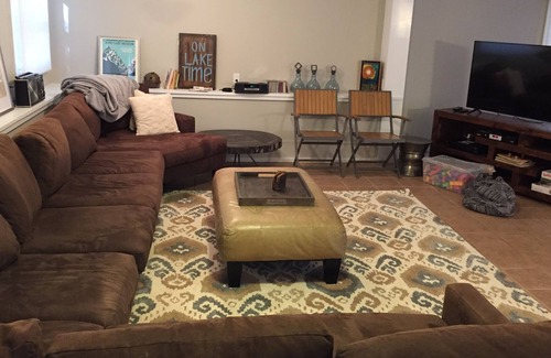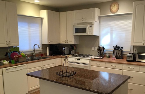 Downstairs – kitchen, full size refrigerator/freezer, dishwasher, microwave, toaster, oven, 4 burner gas stove, large kitchen table, large family room with TV, full bathroom with shower, washer/dryer. The kitchen comes completely stocked with dishes and cookware. We have internet, high speed.