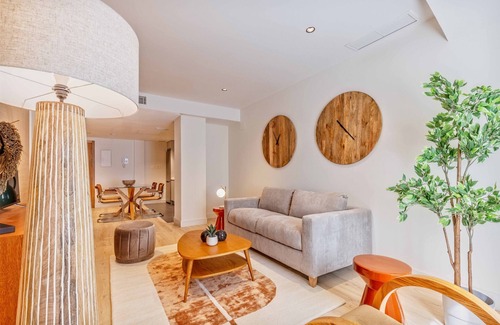 Its comfortable layout and modern design integrate the dining area, a modern American-style kitchen equipped with high-end utensils and appliances, and a spectacular living room with a double sofa bed, smart TV, and decorative elements that make the space a place to enjoy at any time of the day, all in the same space.