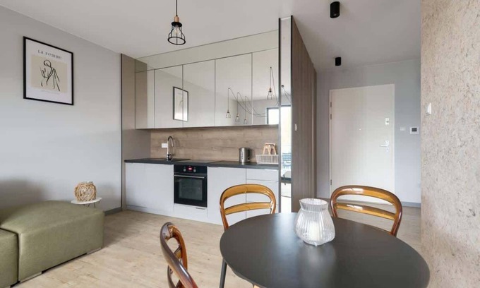 This elegant apartment, perfect for up to 4 guests, features a cozy bedroom and a bright, modern interior with warm, natural details. The living room is furnished with a fold-out sofa, dining area, and flat-screen television. The well-equipped kitchenette includes a refrigerator, induction cooktop, and all essential utensils for convenient meal preparation. The bedroom offers a comfortable double bed and ample wardrobe space for a relaxing stay. The bathroom is sleek and functional, with a walk-in shower, fresh towels, and complimentary toiletries. Pets are welcome, making it an excellent choice for couples, small families, and business travelers. Located in the peaceful Orłowo district of Gdynia, it provides easy access to forest trails, the beach, and nearby attractions.