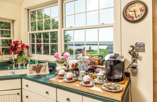 We are located at 500 North Street. The Berry Patch is on the second floor and has a western, spacious lawn view. However, there is an outdoor deck with a spectacular view of the Mississippi River and our double-lot, flower garden. This room provides a Posturpedic Full-sized bed. The bathroom with tub/shower is attached and private. (The hot tub is only available to Penthouse guests on the third floor.)