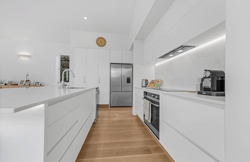 At the heart of the home is a stunning open-plan kitchen, seamlessly flowing into the dining and living areas. The design encourages connection and conversation, making it ideal for both everyday living and entertaining. Large sliding doors open to a beautifully landscaped garden, creating an effortless indoor-outdoor flow.