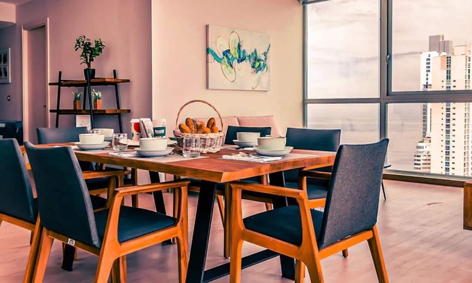 Our apartments are located in the center of the city of Panama, capital of the Republic of Panama, a short distance from restaurants, supermarkets, shopping centers and 5 minutes walk from the Omar Park, an impressive park where you can practice all kinds of sports or Simply breathe pure air in the middle of the city. Includes free parking, janitor and security guard 24/7.