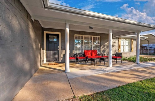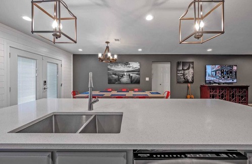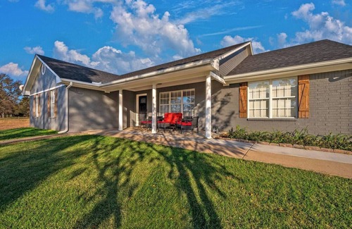 New everything! Open in 2022. Super Clean! Every guest raves about this place! Fantastic Kitchen with huge, white Quartz island; seats 4, Dining seats 8. Open concept kitchen & family rm for great entertaining. Sofa sectional pulls out to recline & watch 70" TV. Strong WiFi. Private office. Comfy beds! Huge playroom w/ Foosball table, beanbag chairs. Full size Washer/Dryer. Front porch seats 6. Fenced back yd w/ grill, chimenea, firepit. Ample parking. 2 miles to Lake Texoma. Low cleaning fee.