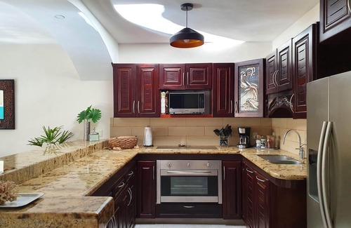 Very spacious with very easy access and private security 24 hours, it has high speed fiber optic internet 150 megabytes, it can go up to 500 megabytes for a minimum extra cost. Two large bedrooms with 3 full bathrooms and very comfortable beds, the kitchen is equipped with everything you need to cook for 8 people, the room is large and comfortable. The 3 TVs have Netflix and two of them with International Satellite HD programming 237 channels. We have a large and comfortable terrace equipped with barbecue grill, laundry area with washer and dryer, there is an OXXO 1 minute walk and large supermarkets just 2 blocks away. The condo has towels, chairs, umbrellas, beach cooler which you can comfortably carry in two carts, in addition to 2 paddle boards included among other things. The rooftop has nice view of the sea and Cozumel Island with its cruises, as well equipped with barbecue and sun beds. Very few offer all these benefits in a totally safe environment.