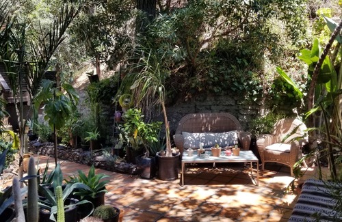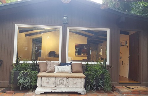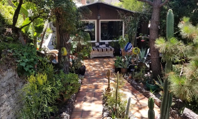 Beautiful relaxing private 2 bedroom home nestled in the bel air canyon with living outdoor space under tree canopy and botanical garden with cacti specimen, big patio with couches, hammocks fire pit a stairway up the hill to beautiful view a home theater projector. and a big private 2 car garage