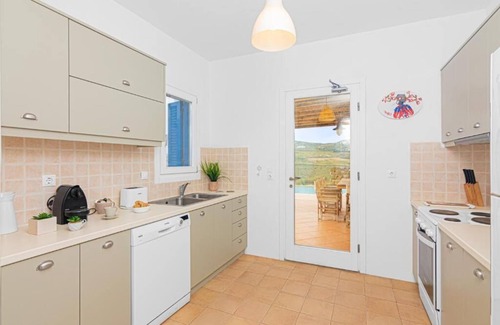 The villa is fully furnished and has 4 bedrooms with queen size beds, 4 bathrooms with showers, a fully equipped kitchen, and a spacious living room. The planning is such that, up to 8 people can be comfortably accommodated, as bedrooms are located on the upper and lower floors of the house. The upper level has one master bedroom with a large open terrace enjoying splendid mountain and sea views. Three bedrooms and two bathrooms are located in the lower level. The kitchen and living room lead to a large veranda with a dining table under a wooden pergola and a private swimming pool, the perfect setting for residents to relax, dine or entertain guests.