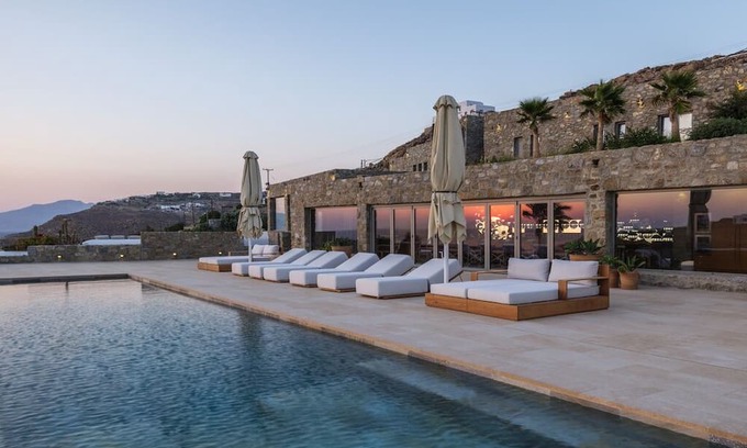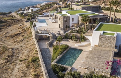 the captivating Mykonos Island. This architecturally striking stone villa blends