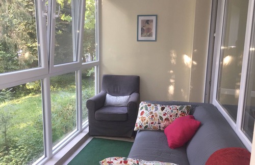 It’s a spacious (20m2) cozy bedroom in our home, covered terrace, French style windows and a pretty view onto a green lawn.