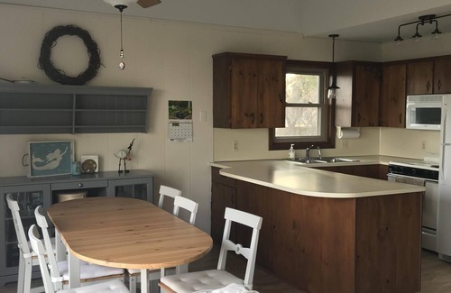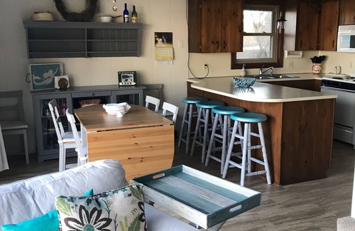 2 - 8 foot sliding doors leading out to a large spacious deck with a beautiful lake view. 1 bedroom downstairs 2 upstairs. Laundry room with washer and dryer. Cottage has large yard for outdoor fun with bonfire pit, bag toss game, horse shoes, bad mitten/ volleyball game. Dock with 2 kayaks, paddle boat & canoe available. Some life jackets available. You can bring your own Motor craft public access right down the road and you can tie up to the dock in front of the house.