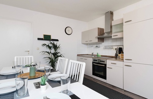 In this simple but comfortable and at the same time high-quality 106 square meter 4-room apartment, all needs for comfortable living are covered. Fully equipped, the apartment is suitable for group trips, students, fitters, trade fair assignments, business trips for short or long stays. 11 minutes by train to Duisburg central station, 30 minutes to Düsseldorf central station: By car only 20 minutes to the exhibition fair (Messe) Essen, 30 minutes to exhibition fair (Messe) Düsseldorf.