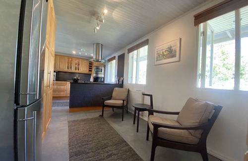 The house has an open kitchen with a dining place for six to eight people. The kitchen is fully equipped. It overlooks both the front and the rear of the house.