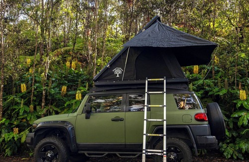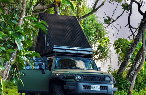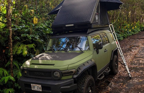 Aloha! This is a perfect 2-in-1 experience unlike any other to explore the island! Enjoy Big Island’s most authentic way to visit with the only outfitted Matte Green FJ Cruiser on island! After booking, we offer a hand crafted guidebook that we created from years of experience and exploring the island of the Big Island. The guidebook includes camping locations, as well as recommendations for food, hiking, and excursions! You’ll be riding and camping in style with the rhino lining matte green and black finish, 4WD, lift kit, and 33 inch wheels. Our space includes all necessary camping gear and supplies, as well as a hard shell roof top tent with a comfortable mattress to sleep on! Must be 21 to book!