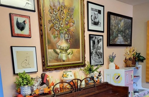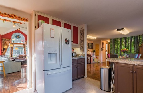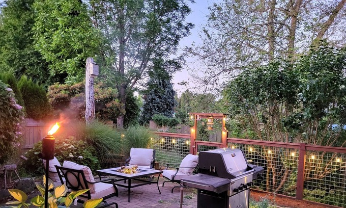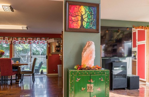 Welcome to the Big Red House located on the edge of beautiful Eugene Oregon! This 2000 sq. ft. home boasts of country charm the moment you pull up with it's gardenesce landscaping and child swing for 2 in the front yard, located right next to a seasonal creek! The open floorplan is light and breezy with a nature feel throughout from real tree branches forming the shelving in the cathedral living room to a forest wall as your backdrop for family meals in the dining room! Nights you will serenaded by a symphony of frogs while you relax for a movie night on the 85" flat screen TV or challenge your friend to a game of Mrs. PacMan or Galaga on the full arcade size game! Let your children's imagination run free with their very own cottage right in the backyard or play in our loft all set for a tea party and toys galore! Enjoy the serene backyard around the fire pit while overlooking our seasonal creek which is home to raccoons, nutria, owls, ducks, lots of birds and hummingbirds, hawks, cranes, bats, possums and who knows what else! The master bedroom has a private bath with shower & his and hers sink, California king size bed and walk in closet! The other 3 bedrooms are roomy and cozy. Let's not forget about our rescue cats and every stay helps us help them and others! For more info. on our current cat situation please feel free to message us :) Last but not least we think it's important to mention at The Big Red House we LOVE the holidays, and do decorate for the season :) Book today and save with NO cleaning fees ever!