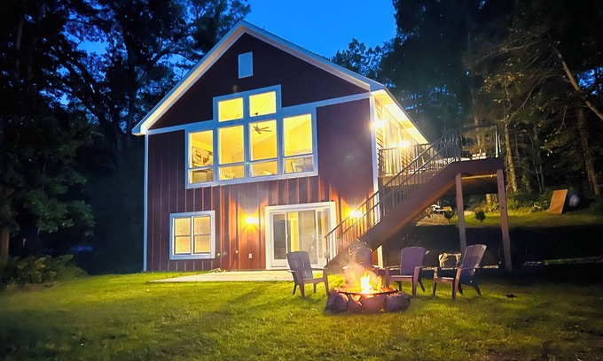 Big Red on Long Lake is a new construction lake home featuring two king bedrooms, one queen bedroom, and one bunkroom with queen/twin bunk combo and futon. The master bedroom includes an ensuite bath. The upper and lower levels each have another full bath. All bathrooms are stocked with white towels, hand soap, shampoo, and conditioner. The spacious kitchen includes a gas stove with built-in air fryer, microwave, and dishwasher. The coffee bar includes a Keuring K-Café coffee maker capable of making lattes and cappucinos, in addition to a regular cup of coffee. We've included some K-cups and sugar to get you started. The living room and lower level rec room are both equipped with fireplaces and large Smart TV's. The lower level rec room also includes a ping pong table, access to the onsite laundry, and a walkout patio leading to the outdoor fire pit and lake. The dining room has a table for six along with seating for four at the island counter. The upper level deck is of the kitchen and dining room with additional seating for four overlooking the lake and stairs down to the lower level patio. The lakeshore in front of the property is gently sloping and ideal for swimming. Lake is 17 feet at the deepest point- perfect for boating, watersports and fishing (mainly sunfish, bass, and pike). Bring your own boat or rent one and tie up to our guest dock. This is a year-round destination ideal for families, weekend getaways, or long vacations. Just minutes from local attractions and only an hour from the Twin Cities.