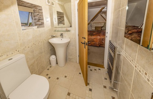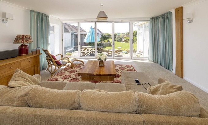 Amazing house (1869 sq ft) just a few steps from the famous Hive Beach. Backing onto open fields the house has off road parking for several vehicles and large comfortable living spaces. Two of the four bedrooms have access to the spacious balcony with wonderful views over fields to the hills and sea beyond. Sleeping arrangements are flexible, depending on your needs. We have a bunk bedded room with a full sized cot and there are two further fold out beds for children aged up to 10/12. There are three further double bedrooms, two with king sized beds and one with a double bed and single bed. The master bedroom has an ensuite with bath. Separate shower room serving bedrooms. Downstairs cloakroom. Very large kitchen leading onto spacious dining room and raised seating area with sea views (50 ft in length, see floorplan) From here, a door leads through to the large and comfortable sitting room (35 feet in length) which has five panel bifold doors to the large garden and three comfortable sofas. Now TV Sports Package included with Sky Sports.