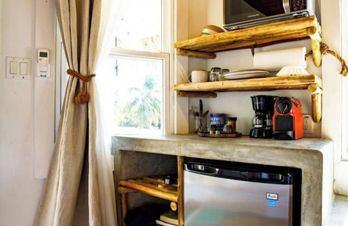 The Bikini Cabana is a studio-style, air-conditioned cabana with a queen bed, full bathroom and kitchenette area with microwave, coffee maker, refrigerator. Enjoy the amazing ocean views and the sound of the waves just outside your front door.