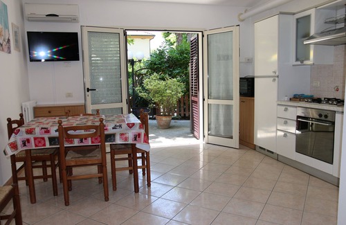 two-room apartment on the ground floor, living room with kitchenette and single sofa bed, bedroom with double bed and bunk bed, bathroom with shower and washing machine, TV, air conditioning, outdoor seating with table and chairs, fenced garden , parking, 350 meters from the sea, in a quiet location ideal for families with children.