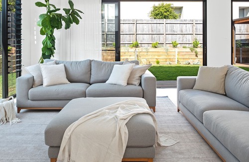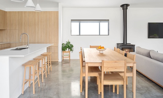 Relax in a serene, newly built contemporary beach house, elevated by its stunning coastal surroundings. Nestled in a quiet street and just a stone throw away from the beach, lake and national park.