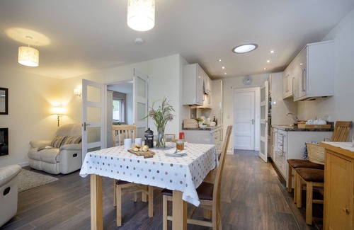 Boasting a lovely home-from-home feel, step into the inviting open-plan living space, featuring a contemporary kitchen, dining area and cosy sitting area. The fully equipped kitchen has everything you need, including an electric oven and hob, microwave, fridge/freezer, and dishwasher. Savour meals at the lovely dining table, and open the double doors to your sunlit patio, allowing fresh air to flow through. After a day of exploring the countryside, unwind in the cosy sitting area, complete with comfortable recliner sofas, a Smart television, and log-effect electric fire.