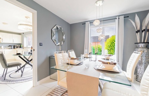 Three Bedroom Birmingham Stay Free Parking Perfect for Families Travellers Professionals M6 in Birmingham offers a spacious house with three bedrooms and three bathrooms. The living room features a sofa and dining area, providing ample space for relaxation and meals.