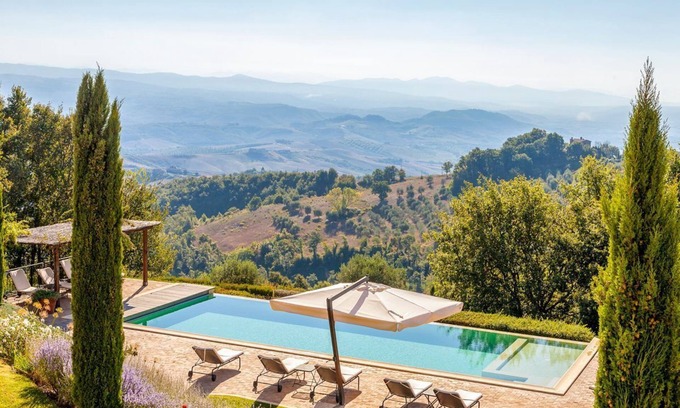This lavishly renovated tower-turned-villa in Umbria has luxurious touches at every turn. Each guest will find their own pleasure; fitness lovers will hit the sauna and gym and the media room will enchant movie buffs. Bookworms will bury themselves in the extensive English library, while the chef of the family will perfect their pizza at the outdoor stone oven. All this, set above rolling hills at the border of Tuscany and Lazio.