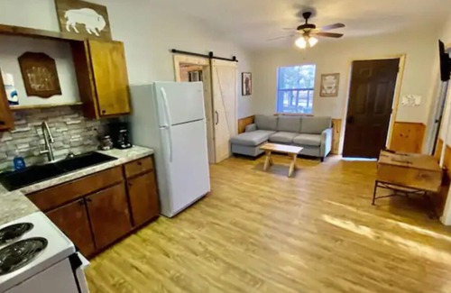 Bison Cabin is newly renovated and is part of the Rocky Point Cabins property. This rustic cabin is the largest cabin on the property. It is a two private bedroom cabin that has a back-deck surrounded by the forest, along with a fire-pit and an outdoor charcoal grill. This rustic cabin has everything you need to fulfill your getaway including a fully furnished kitchen, FREE Wifi, and a smart TV with cable. This cabin is a short three minute drive from Chickasaw National Park. and Lake Arbuckle.