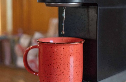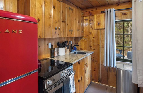The full bathroom features a standing shower and is stocked with complimentary toiletries and plush towels. The kitchen is equipped with a stove, oven, microwave, mini waffle maker and Keurig coffee maker. Adding a touch of vintage flair, a retro red fridge and matching tea kettle complete the space.