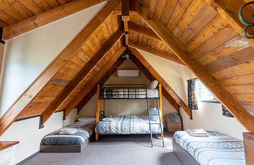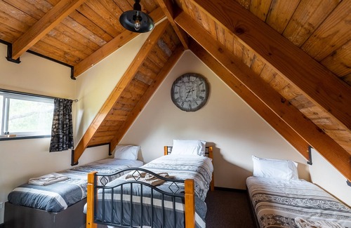 The Chapel can sleep up to 8 guests, with a queen bedroom downstairs, 6 singles and 1 double bed upstairs.