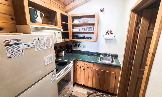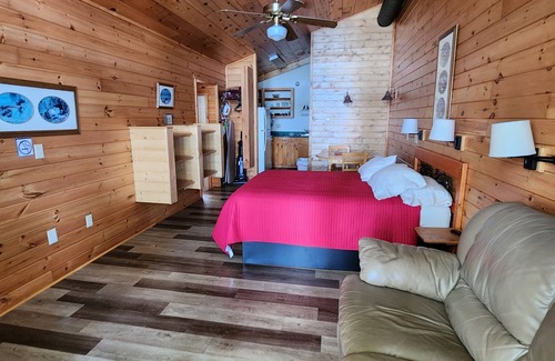 Check out the Black Oak Cabin. This studio cabin is the perfect space for a vacation on the Chippewa Flowage! This cabin comes fully equipped with solid top electric range, refrigerator/freezer, microwave, coffeemaker, toaster, electric griddle, crockpot, all cookware, utensils and dishes, kitchen linens, Flat screen HD TV, with 100+ channels Dish Network TV, gas fireplaces, gas heat, central air, decks with patio furniture & hooded grills. Black Oak Cabin has a maximum occupancy of 2 guests.