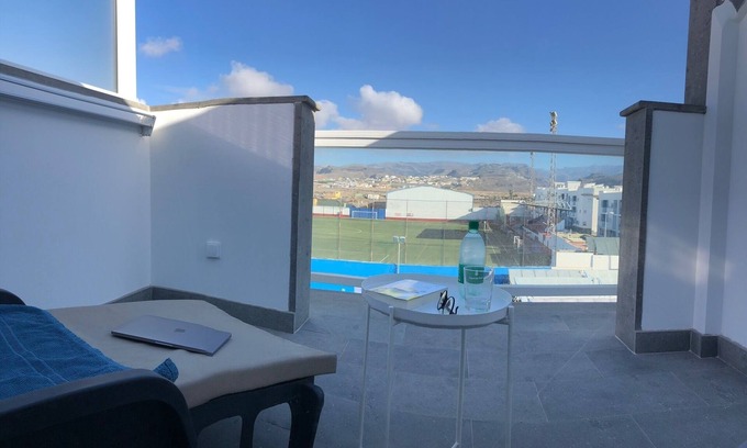 Ático en la zona sur de Gran Canaria, El Tablero de Maspalomas (San Bartolomé de Tirajana). Dispone de WiFi, aire acondicionado frío calor, aislamiento térmico acústico y todo lo necesario para unas vacaciones ideales. Situado a 5km de la playa, aparcamiento gratuito, centro de ocio y de la zonas turísticas se encuentra ubicado en una zona residencial con todos los servicios, parada de autobús, centro comercial,supermercados, gasolinera, bares, restaurantes. Le asesoramos en todo lo que necesite