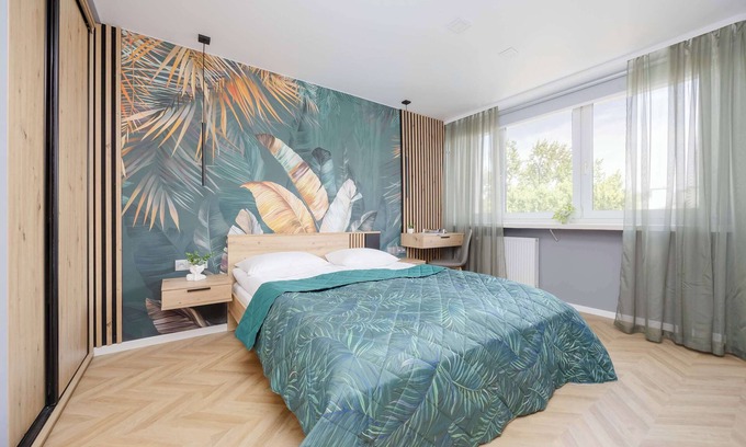 The apartment has been decorated in a modern style, with attention to aesthetics, comfort and functionality. Light wall colours, a wooden floor in a herringbone pattern and consistent finishes create a friendly and tidy space. The living area of the apartment has been designed as a spacious and open space that combines the comfort of relaxation with modern functionality. There is a light grey sofa bed, providing a comfortable place for both relaxation and night rest. Opposite, there is a TV mounted on the wall, which allows for free viewing from anywhere in the living room. The kitchenette has been equipped with modern appliances that provide full freedom during everyday stay. Guests have at their disposal an induction hob, dishwasher, fridge with freezer, microwave, as well as an electric kettle, toaster and capsule coffee machine. Each element has been carefully selected to ensure maximum comfort and ease of use. The bedroom has been designed with relaxation and an atmosphere conducive to calming down in mind. The focal point of the room is a large bed placed against the background of decorative wallpaper. On both sides of the bed there are wooden bedside tables with lamps that provide atmospheric lighting. The room also has a desk with a comfortable chair, which can be used as a place to work or study. The bathroom is decorated in bright colors, with expressive yellow accents that give the interior freshness and energy. There is a shower, a modern washbasin with a large mirror and spacious cabinets for storing cosmetics and towels. The apartment is an excellent option for people looking for a stylish, fully equipped place to live or relax. Guests can count on full comfort in a space that combines aesthetics with functionality.