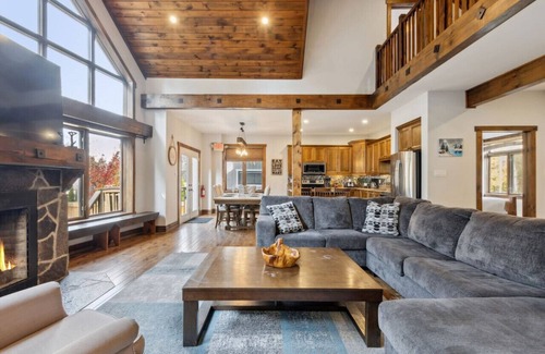Unwind among the cozy decor, including a gorgeous antler chandelier overlooking the main living area, furnished with a large sectional couch facing 1 of the 2 wood burning fireplaces (bring your own firewood) and a Smart TV. Upstairs, in the loft, you’ll find 2 additional chaise lounges. In the basement living area, you can enjoy the games area with the pool table, foosball, and darts surrounding the bar and second wood burning fireplace.