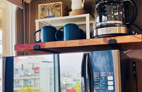 Located on the 7th floor, there are only 2 units per floor and the apartment is accessible by elevator or stairs. This unit is all electric and has an open view from the bedroom and street view from the living room. Both rooms have dual curtains (semi sheer and full blackout) for privacy. Entrance to the building from the street is through double doors.