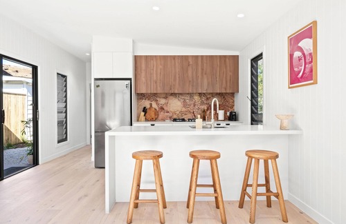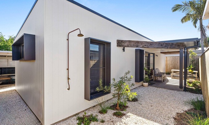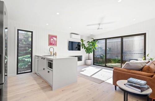 Blue Ash is a brand new one bedroom studio in a quiet cul-de-sac, just a few minutes walk from the beach and Lennox village. Set behind the main residence, but with its own private entry, this stylishly furnished place has an architects touch, with features such as marble splash backs, a sleek and inviting bathroom, timber flooring and light-filled rooms. The spacious bedroom has a queen bed and built-ins, with louvers and a sliding door to catch the afternoon breeze.