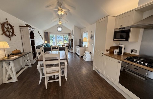 Enter through the back door into the hallway and through to the spacious open plan living area. To the right is the kitchen with all the appliances you need including a tall fridge-freezer and coffee machine. To the left is the dining space, with dedicated work space, and through to the living area, with 2 sofas, log burner and TV.