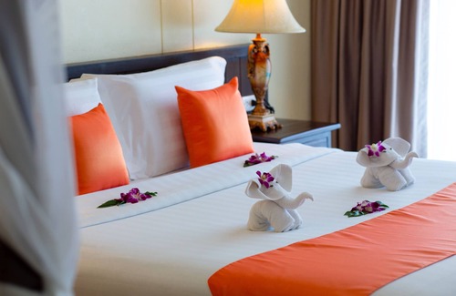 Blue Bay Resort offers 186 shared accommodations, which are air-conditioned, accessible via exterior corridors, and feature safes and complimentary bottled water. Rooms open to balconies or patios. These individually decorated accommodations have separate sitting areas. 40-inch LED televisions come with cable channels. Bathrooms include showers, bathrobes, slippers, and complimentary toiletries.