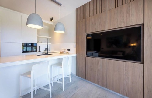 The apartment has a fully & high quality equipped kitchen including a refrigerator, microwave and dishwasher. The living room has cushioned seats and sofas where you can rest and enjoy smart TV or a large number of home entertainment options. Outside, you can enjoy the Caribbean evening breeze from your balcony with a stunning view over the Caribbean sea. The apartment has a fully air-conditioned bedroom, with a king-size bed.