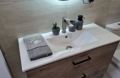 The beautiful appointed bathroom has a rain water shower, vanity toilet with washing machine and tub included.